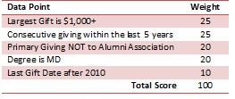 Once you select a few data points that are of interest you can begin the process of building a score by ranking the ones that are most important and assigning weights to each variable in terms of importance. Below is an example of this process, from one of our higher education clients who were focusing on specific degree donor recipients for a targeted event invite.